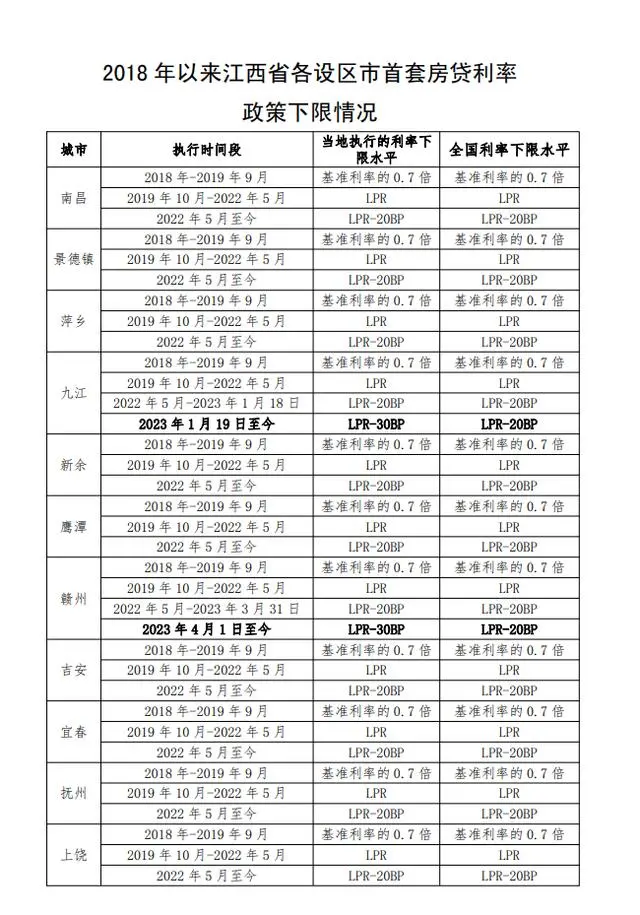 江西省各设区市首套房贷利率政策下限情况公布