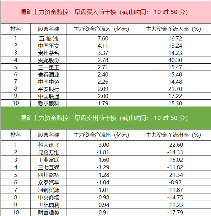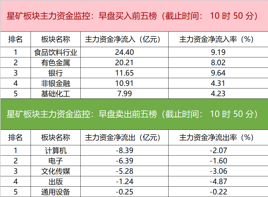 财联社9月4日电,财联社星矿数据显示,今日早盘主力资金净流入食品饮料行业、有色金属、银行等板块,净流出计算机、电子、文化传媒等板块,其中食品饮料行业净流入超24亿元。个股方面,五粮液大涨,主力资金净买入7.60亿元,中国平安、贵州茅台、安妮股份获主力资金净流入居前;科大讯飞遭净卖出超3亿元,昆仑万维、工业富联、三七互娱主力资金净流出额居前。