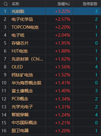 财联社9月5日电,市场早盘震荡调整,三大指数均小幅下跌,沪指领跌。盘面上,半导体板块再度走强,光刻胶、存储芯片等方向领涨,同益股份、格林达涨停。光伏概念股盘中反弹,帝尔激光、广信材料20CM涨停,爱旭股份、豫能控股涨停。华为概念股持续活跃,捷荣技术、瀛通通讯、华映科技等多股涨停。下跌方面,房地产板块陷入调整,中迪投资跌停。总体上个股跌多涨少,两市超3300只个股下跌。沪深两市今日成交额5236亿,较上个交易日缩量260亿。板块方面,光刻胶、TOPCON电池、存储芯片、华为概念等板块涨幅居前,房地产开发、新型城镇化、传媒、养殖等板块跌幅居前。截至收盘,沪指跌0.63%,深成指跌0.46%,创业板指跌0.05%。北向资金方面,沪股通早盘净流出23.46亿,深股通早盘净流出19.85亿。
