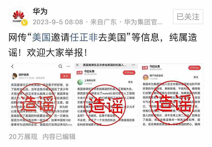华为辟谣:网传“美国邀请任正非去美国”不实