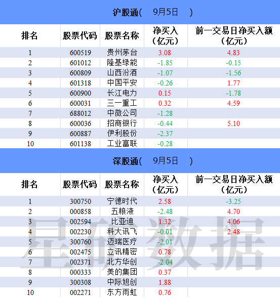 财联社9月5日电,北向资金今日净卖出46.09亿元。五粮液、伊利股份、北方华创分别遭净卖出2.48亿元、2.37亿元、2.04亿元;贵州茅台逆势获净买入3.08亿元。