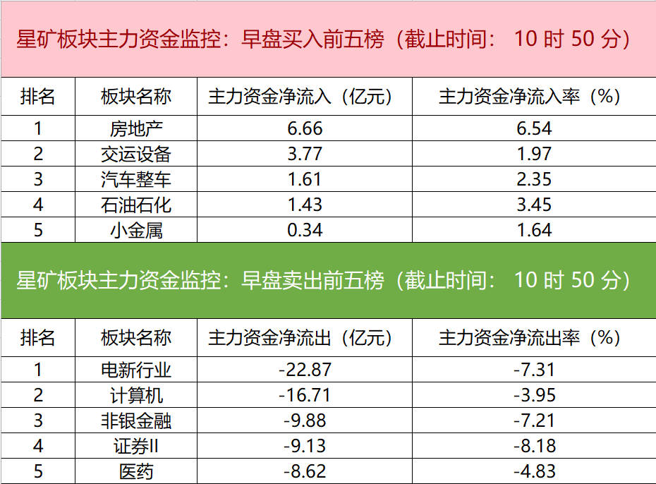 财联社9月6日电,财联社星矿数据显示,今日早盘主力资金净流入房地产、交运设备、汽车整车等板块,净流出电新行业、计算机、非银金融等板块,其中电新行业净流出超22亿元。个股方面,张江高科涨停,主力资金净买入3.81亿元,N威尔高、赛力斯、北方华创获主力资金净流入居前;隆基绿能遭净卖出超3亿元,东方财富、爱旭股份、同益股份主力资金净流出额居前。