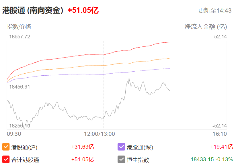 财联社9月6日电,截至目前,南向资金净流入超50亿港元,其中港股通(沪)净流入超31亿港元,港股通(深)净流入超19亿港元。