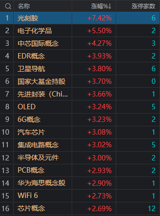 财联社9月6日电,大盘全天震荡分化,三大指数涨跌不一。盘面上,芯片股全线爆发,其中光刻胶方向领涨,扬帆新材、容大感光、蓝英装备均20CM涨停;EDA概念股午后拉升,概伦电子20CM涨停。卫星导航概念股大涨,震有科技、天迈科技、神宇股份均20CM涨停。华为概念股继续活跃,华力创通、捷荣技术、华映科技等超10股涨停。地产股震荡反弹,中国武夷涨停。下跌方面,游戏传媒股陷入调整,恺英网络、冰川网络跌超5%。总体上个股涨多跌少,两市超2700只个股上涨。沪深两市今日成交额7713亿,较上个交易日缩量326亿。板块方面,光刻胶、卫星导航、Chiplet、军工等板块涨幅居前,港口、传媒、游戏、养殖等板块跌幅居前。截至收盘,沪指涨0.12%,深成指跌0.24%,创业板指跌0.47%。北向资金全天净买入0.41亿元,其中沪股通净卖出17.61亿元,深股通净买入18.02亿元。