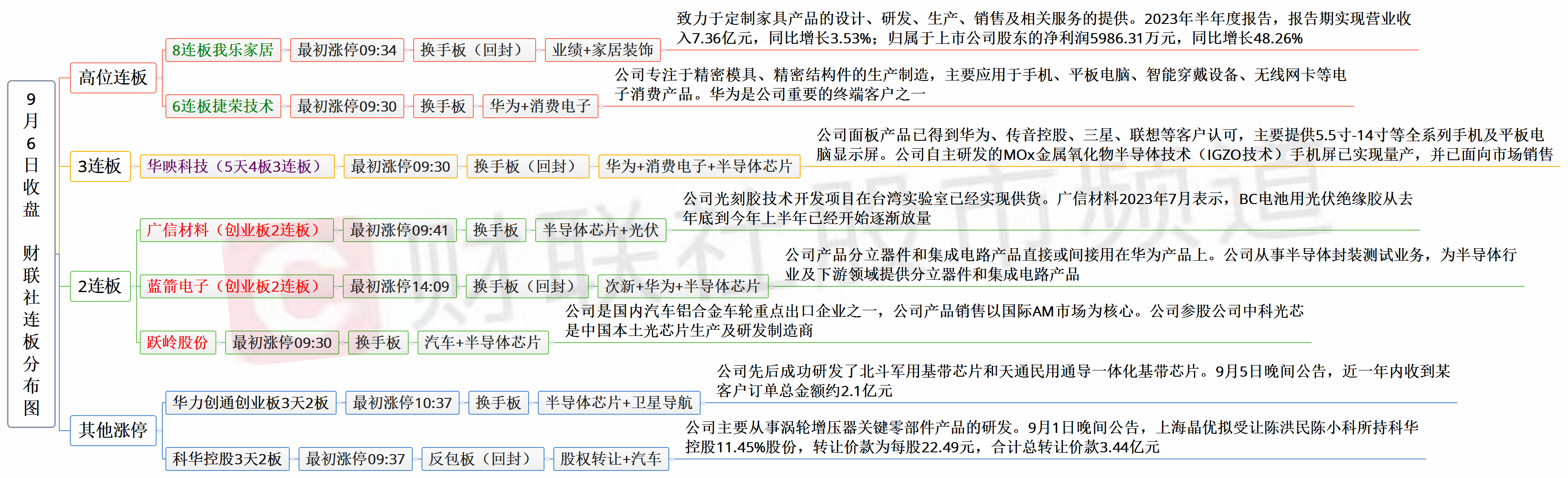 今日共37股涨停,连板股总数6只,上一交易日共19股涨停,涨停股晋级率31.57%(不含ST股、退市股及未开板新股)。个股方面,我乐家居放量涨停晋级8连板,除开一度11连板的日播时尚,已经是年内第二高连板股。此外,捷荣技术6板、华映科技5天4板,不过连板断层严重,其余连板股仅为2板。市场短线情绪高涨,游资主导行情迹象明显,为了避免量化基金冲击,37只涨停股中有22只非两融标的。板块方面,华为新款手机Mate60系列持续引发激烈讨论,板块关注度居高不下,叠加早盘捷荣技术、华映科技超预期连板激活板块情绪,华为产业链强势向上反包;受华为产业链带动,芯片板块午后加速上行,广信材料、蓝英装备、扬帆新材等近8只个股20CM涨停。