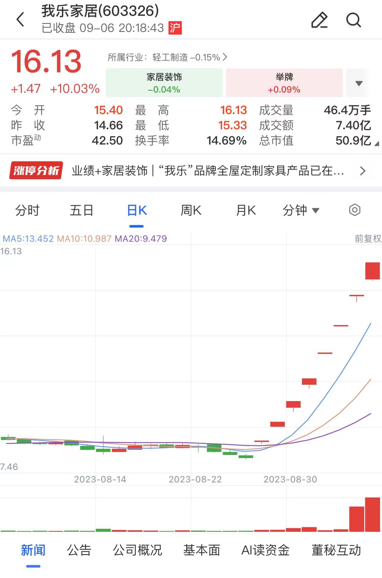 财联社9月6日电,上交所就我乐家居股东涉嫌违规减持下发监管工作函。我乐家居股东于范易及其一致行动人6月30日-9月6日累计减持7.11%公司股份。我乐家居股票自2023年8月28日至9月6日区间累计上涨幅度为114.21%。