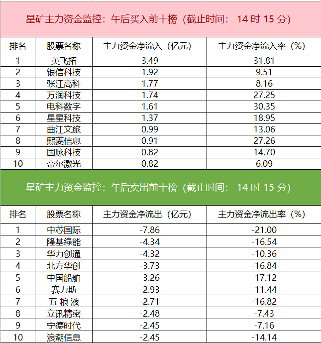财联社9月7日电,财联社星矿数据显示,今日主力资金净流入社会服务、港口、建筑材料等板块,净流出电子、电新行业、交运设备等板块,其中电子板块净流出91.27亿元。个股方面,英飞拓涨停,主力资金净买入3.49亿元,银信科技、张江高科、万润科技获主力资金净流入居前;中芯国际遭净卖出超7亿元,隆基绿能、华力创通、北方华创等主力资金净流出额居前。
