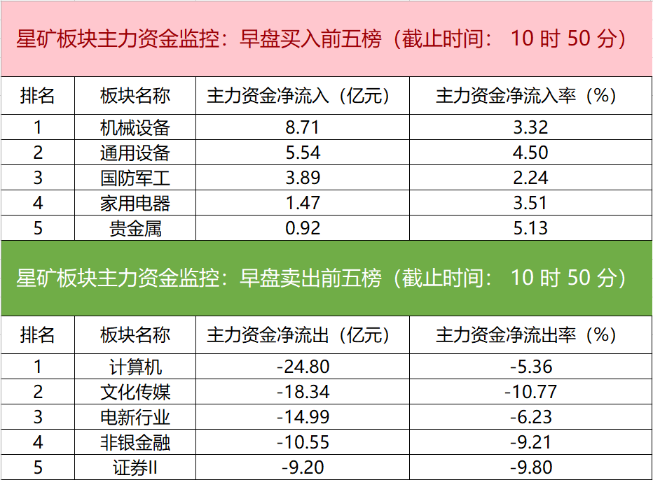 财联社9月8日电,财联社星矿数据显示,今日早盘主力资金净流入机械设备、通用设备、国防军工等板块,净流出计算机、文化传媒、电新行业等板块,其中计算机板块净流出超24亿元。个股方面,N中巨芯大涨,主力资金净买入4.06亿元,浙江世宝、上海电气、蓝英装备获主力资金净流入居前;星星科技遭净卖出超2亿元,万润科技、英飞拓、贵州茅台主力资金净流出额居前。