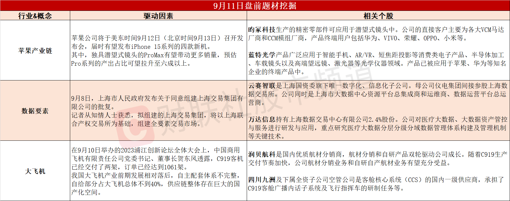 ①iPhone 15或将搭载潜望式镜头,有望给手机供应链带来全新机遇。②上海拟组建上海交易集团有限公司,数据要素商业模式加速落地。③C919客机订单已达1061架,供应链整体存在巨大国产化空间。