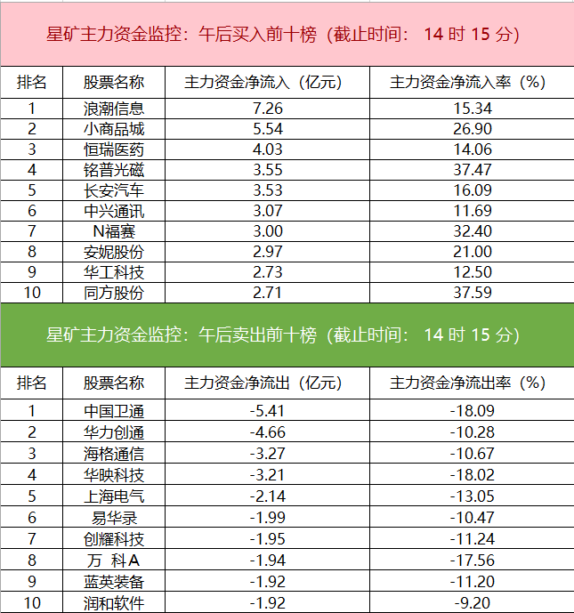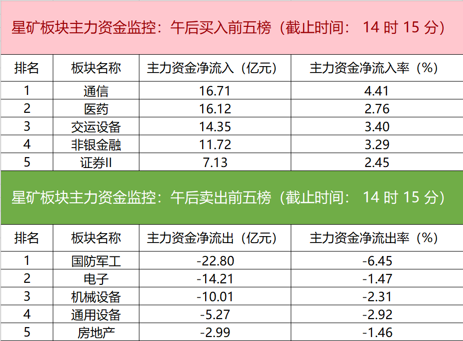 财联社9月11日电,财联社星矿数据显示,今日主力资金净流入通信、医药、交运设备等板块,净流出国防军工、电子、机械设备等板块,其中国防军工板块净流出22.80亿元。个股方面,浪潮信息一度涨停,主力资金净买入7.26亿元,小商品城、恒瑞医药、铭普光磁获主力资金净流入居前;中国卫通遭净卖出超5亿元,华力创通、海格通信、华映科技等主力资金净流出额居前。
