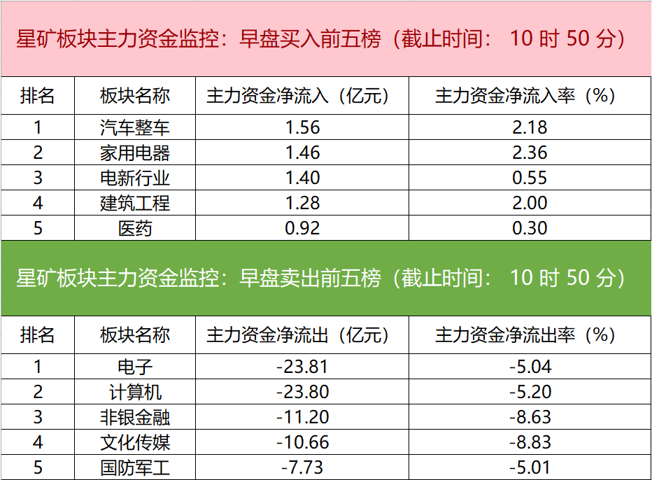 财联社9月12日电,财联社星矿数据显示,今日早盘主力资金净流入汽车整车、家用电器、电新行业等板块,净流出电子、计算机、非银金融等板块,其中电子板块净流出超23亿元。个股方面,光迅科技涨停,主力资金净买入2.81亿元,比亚迪、华工科技、融捷股份获主力资金净流入居前;张江高科遭净卖出超5亿元,荣联科技、同方股份、人民网主力资金净流出额居前。