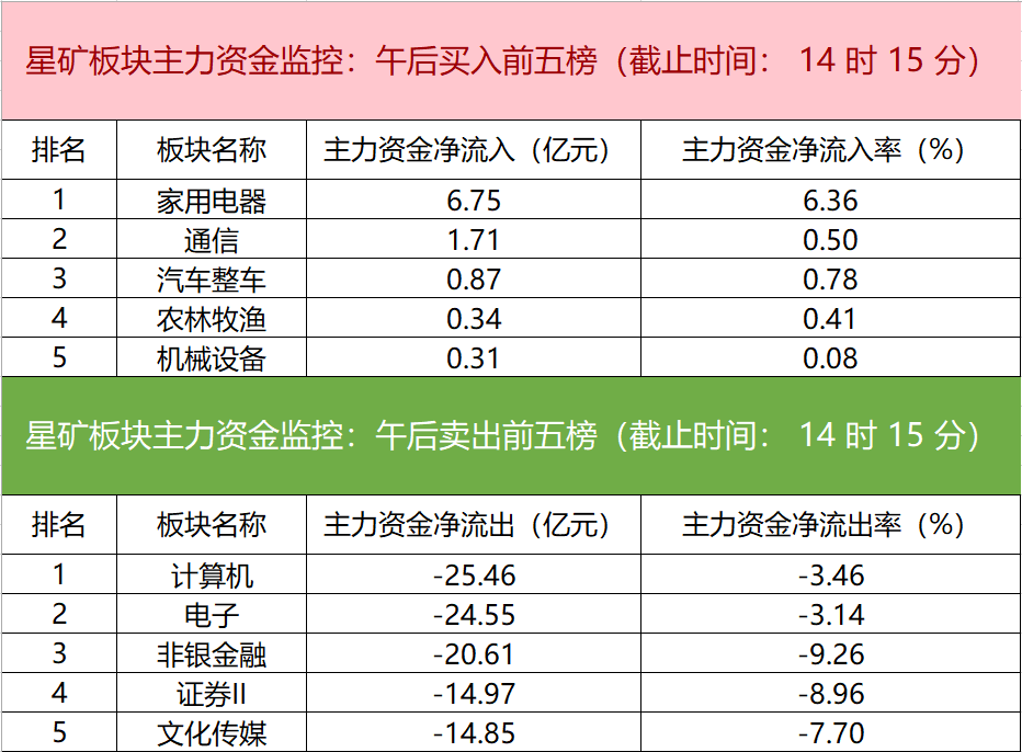 财联社9月12日电,财联社星矿数据显示,今日主力资金净流入家用电器、通信、汽车整车等板块,净流出计算机、电子、非银金融等板块,其中计算机板块净流出25.46亿元。个股方面,四川长虹涨停,主力资金净买入5.10亿元,比亚迪、光迅科技、拓维信息获主力资金净流入居前;张江高科遭净卖出超8亿元,荣联科技、人民网、华力创通等主力资金净流出额居前。