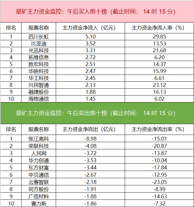 主力资金监控:四川长虹净买入超5亿元