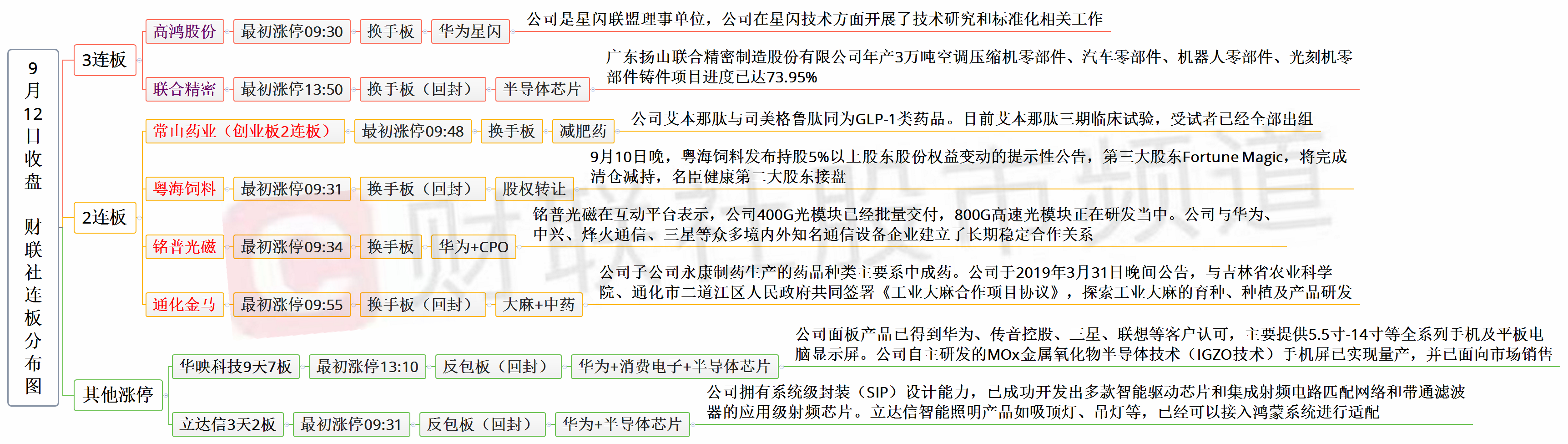 今日共27股涨停,连板股总数6只,上一交易日共27股涨停,涨停股晋级率22.22%(不含ST股、退市股及未开板新股)。个股方面,高位股未能更进一步,捷荣技术全天弱势震荡,一度跌超8%,冠石科技、张江高科双双断板,市场连板高度被压缩至3连板。不过华映科技大幅低开后涨停反包录得9天7板,反映出华为概念人气依旧火热,未来仍可能继续高位宽幅震荡。板块方面,医药板块走强,其中减肥药、工业大麻分支表现强势,板块驱动力来源于美股映射,昨夜美股大麻板块涨势猛烈,冠军成长、极光大麻涨超70%,此外减肥药龙头诺和诺德、礼来不断刷新历史新高;华为产业链内部分化加剧,消息面上,华为宣布将于9月14日在巴塞罗那举行发布会,板块经过短时间内的大涨,部分资金有利好兑现的担忧,选择抛售。沪深两市今日成交额7083亿,较上个交易日缩量1327亿,存量博弈格局下,市场难以打破“小作文”驱动的题材炒作行情。