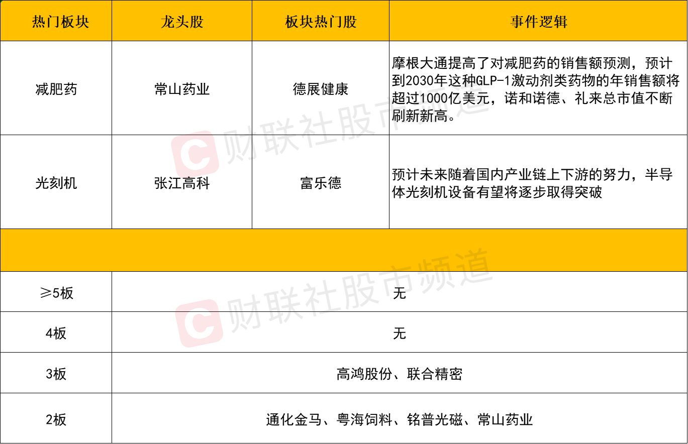 ①今日市场延续分化态势,其中减肥药方向持续发酵连续两日涨幅居前,光刻机板块于午后再度探底回升; ②随着量能的再度萎缩,市场的风险偏好再度下降,广信材料、奥普光电、先锋电子等高位人气股遭遇重挫。