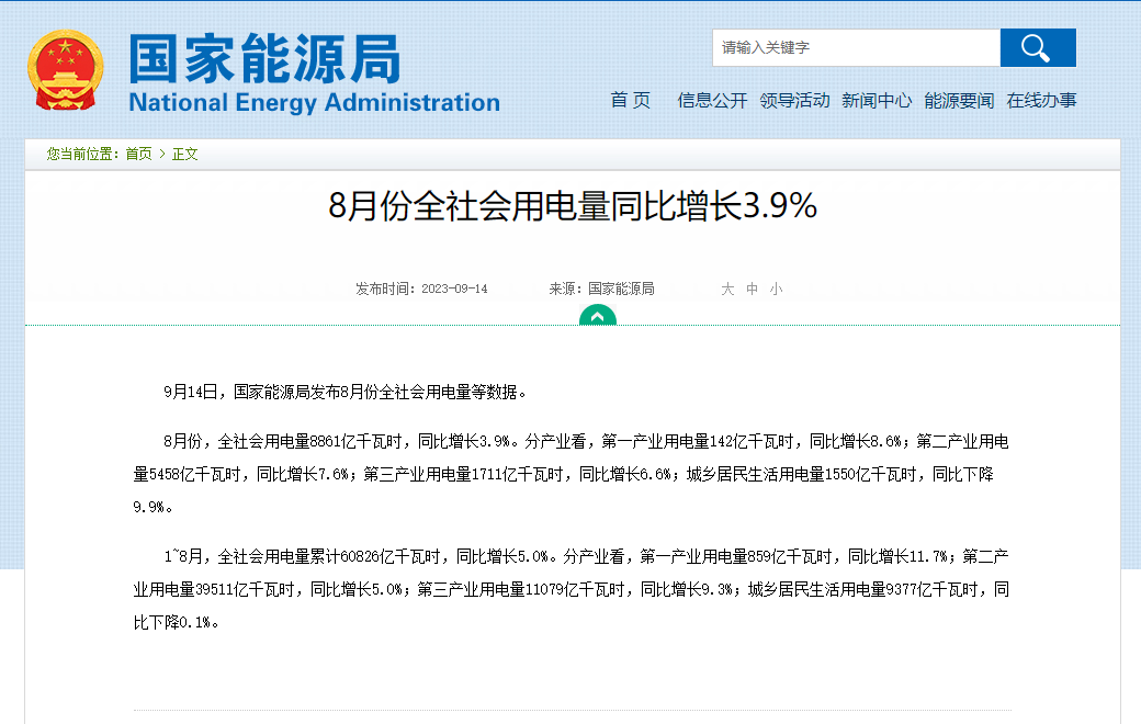 8月份,全社会用电量8861亿千瓦时,同比增长3.9%。分产业看,第一产业用电量142亿千瓦时,同比增长8.6%;第二产业用电量5458亿千瓦时,同比增长7.6%;第三产业用电量1711亿千瓦时,同比增长6.6%;城乡居民生活用电量1550亿千瓦时,同比下降9.9%。