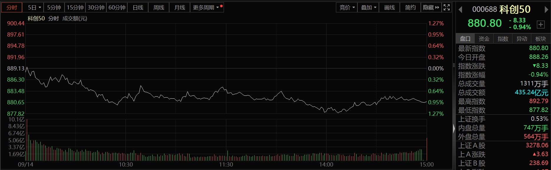 《科创板日报》14日讯,今日,科创50指数下跌0.94%,报880.8点。盘面上,光学光电子、通信板块走强,德科立涨超11%,灿勤科技、三旺通信、盟升电子等走高;华为星闪概念、北斗导航概念回调,创耀科技、司南导航均跌超9%;半导体板块持续承压,长光华芯、锴威特、甬矽电子等多股跌超5%。个股方面,新股N盛科-U上市首日收涨46.51%。