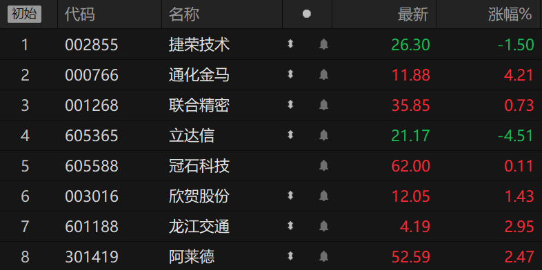 财联社9月15日电,市场焦点股捷荣技术(12天10板)低开1.50%,工业大麻概念股通化金马(12天7板)高开4.21%,芯片产业链的联合精密(5板)高开0.73%、立达信(7天5板)低开4.51%、冠石科技(7天5板)高开0.11%,福建本地股欣贺股份(2板)高开1.43%,东北振兴概念股龙江交通(3天2板)高开2.95%,5.5G概念股阿莱德(创业板首板)高开2.47%。