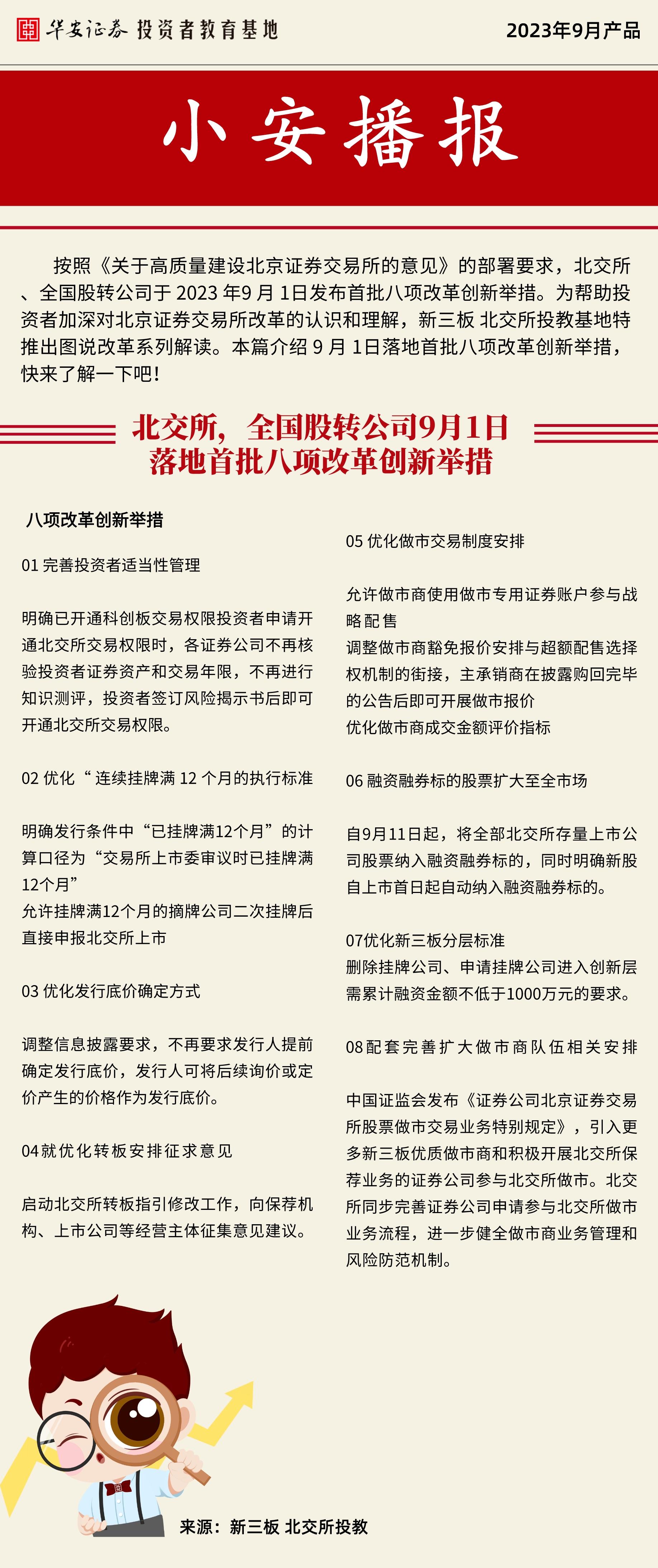 小安播报 | 北交所,全国股转公司9月1日落地首批八项改革创新举措