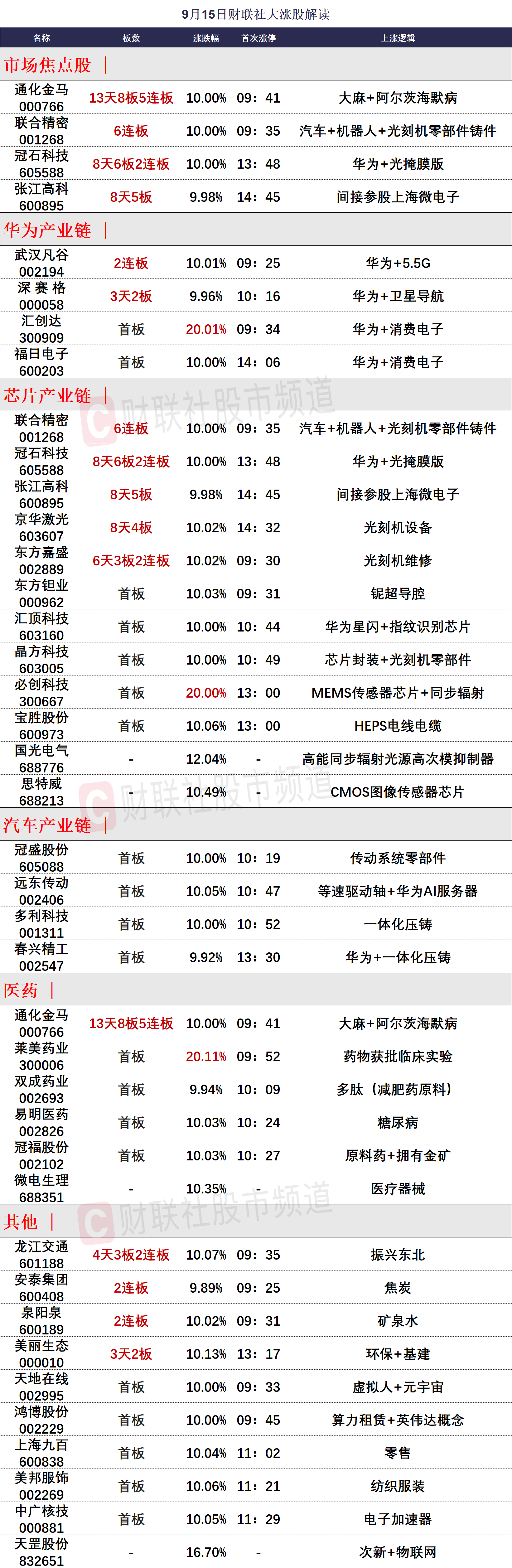 今日共32股涨停,连板股总数8只,12股封板未遂,封板率为73%(不含ST股、退市股及未开板新股)。个股方面,大麻+阿尔茨海默病概念的通化金马13天8板,光刻机板块联合精密6板、张江高科8天5板、京华激光8天4板、东方嘉盛6天3板,光掩膜版的冠石科技8天6板,东北本地股龙江交通4天3板,华为产业链的武汉凡谷2板、深赛格3天2板,煤炭股安泰集团2板,食品饮料板块的泉阳泉2板。今日收涨个股2572只,收跌个股2258只。