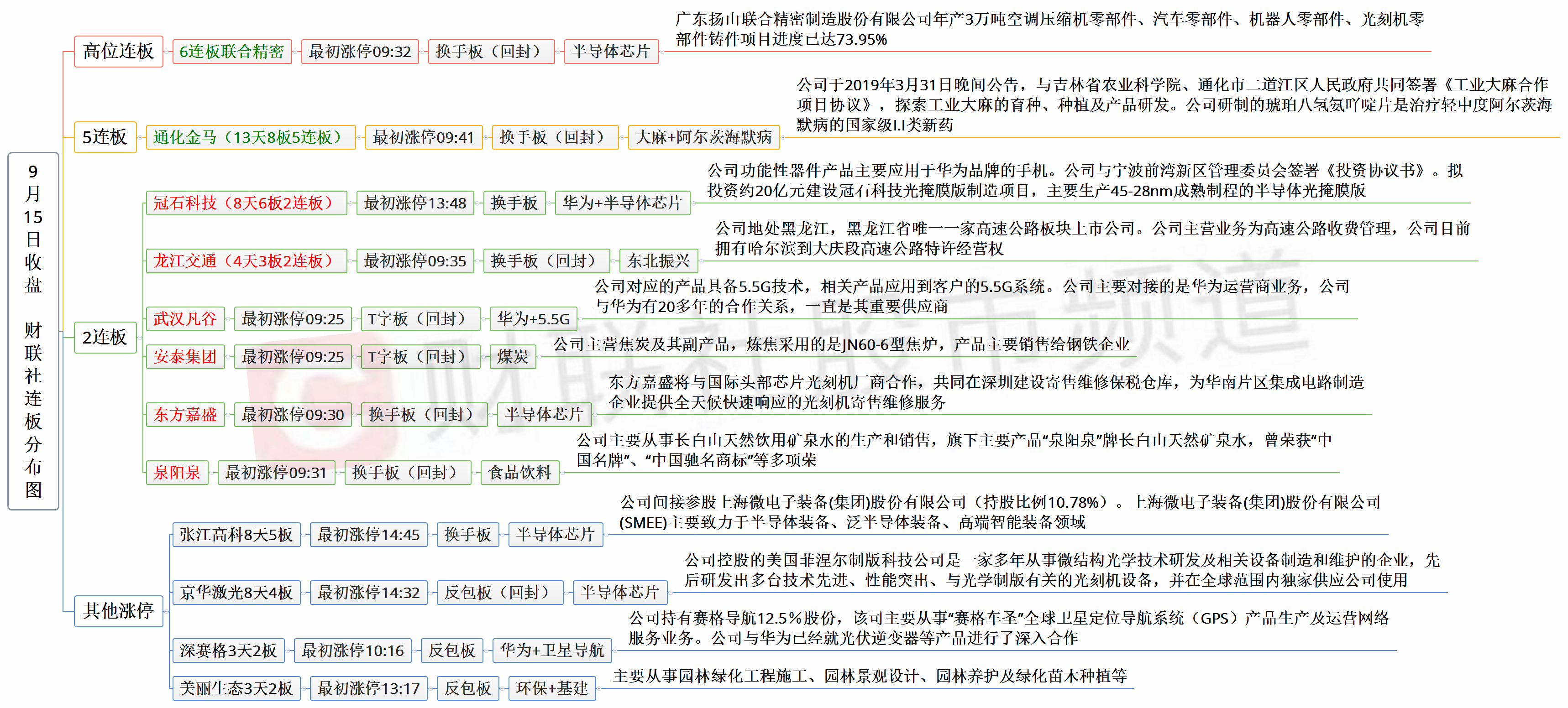 今日共32股涨停,连板股总数8只,上一交易日共23股涨停,涨停股晋级率34.78%(不含ST股、退市股及未开板新股)。个股方面,位置最高的捷荣技术与华映科技双双调整,联合精密缩量涨停晋级6连板,通化金马5连板并录得13天8板。整体来看,近期题材炒作行情火爆,但华为星闪、5.5G、福建本地股等题材却大多是“一日游”行情,没能营造出良好的赚钱效应,目前仅剩光刻机板块与极少数华为概念个股仍受到资金青睐。板块方面,光刻机板块继续走强,今日HEPS概念发酵,必创科技、宝胜股份午后秒板,并带动张江高科从水下大幅反弹并封板,斩获8天5板;医药板块全线走强,消息面上,人民日报发文称,9月以来,医药领域的学术会议陆续恢复,不少学术会议通知恢复召开。