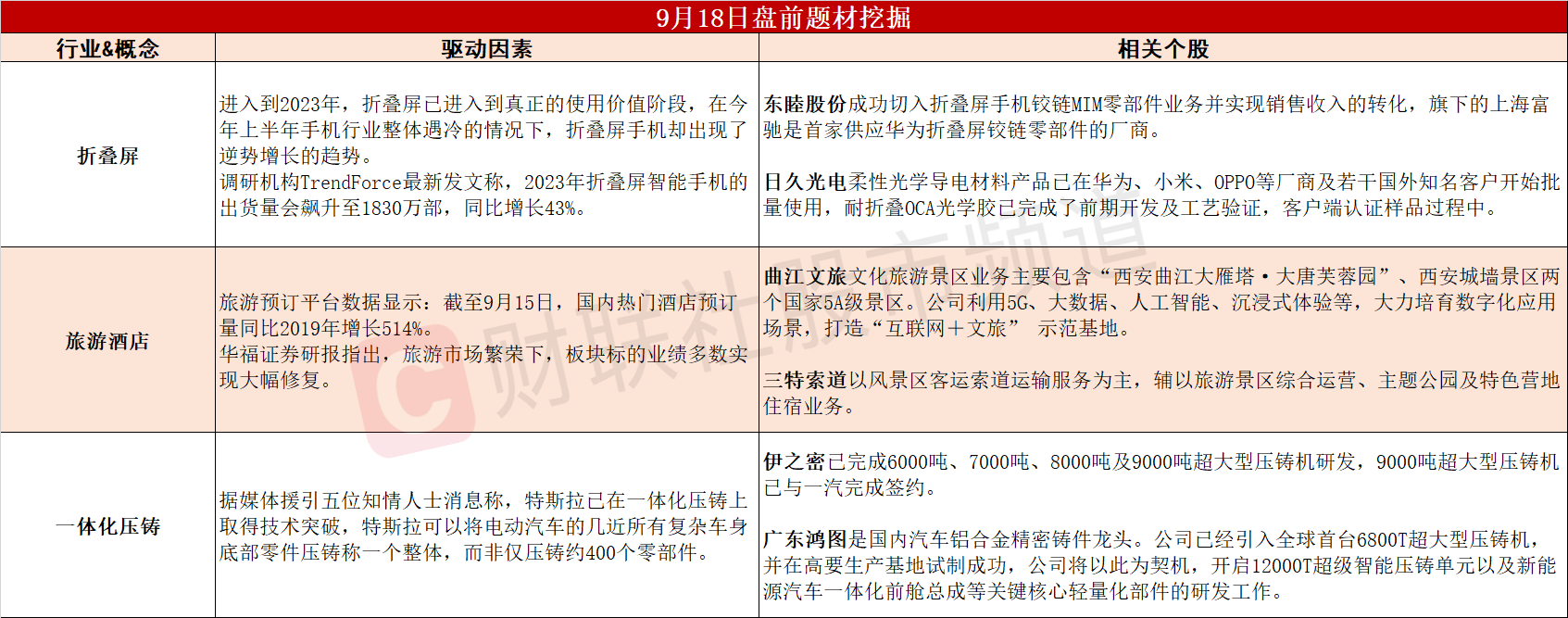 ①折叠屏手机逆势增长,机构称出货量或同比大增43%。②国内热门酒店预订量暴涨超500%,旅游酒店板块标的业绩有望大幅修复。③特斯拉取得新突破,一体化压铸工艺渗透率有望加速提升。