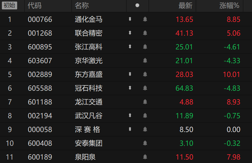 财联社9月18日电,市场焦点股通化金马(13天8板)高开8.85%,光刻机板块联合精密(6板)高开5.06%、张江高科(8天5板)低开4.61%、京华激光(8天4板)低开4.33%、东方嘉盛(6天3板)竞价涨停,光掩膜版的冠石科技(8天6板)低开4.83%,东北本地股龙江交通(4天3板)高开8.93%,华为产业链的武汉凡谷(2板)低开0.75%、深赛格(3天2板)平开,煤炭股安泰集团(2板)低开0.32%,食品饮料板块的泉阳泉(2板)高开7.98%。