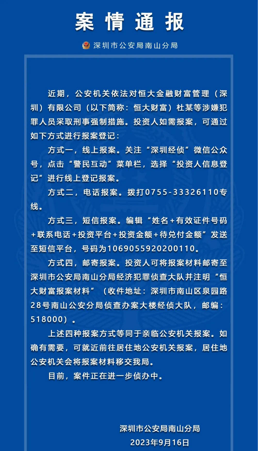 财联社9月18日电,截至发稿,中国恒大(03333.HK)跌19.38%。根据深圳南山公安微信公众号消息,公安机关已于近期依法对中国恒大(03333.HK)旗下财富管理服务平台恒大金融财富管理(深圳)有限公司杜某等涉嫌犯罪人员采取刑事强制措施。相关案件正在进一步侦办中,投资人可通过线上、电话、短信及邮寄报案。