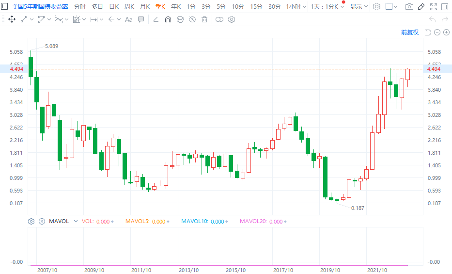 财联社9月19日电,美国5年期国债收益率上升至4.504%,为2007年以来最高水平。