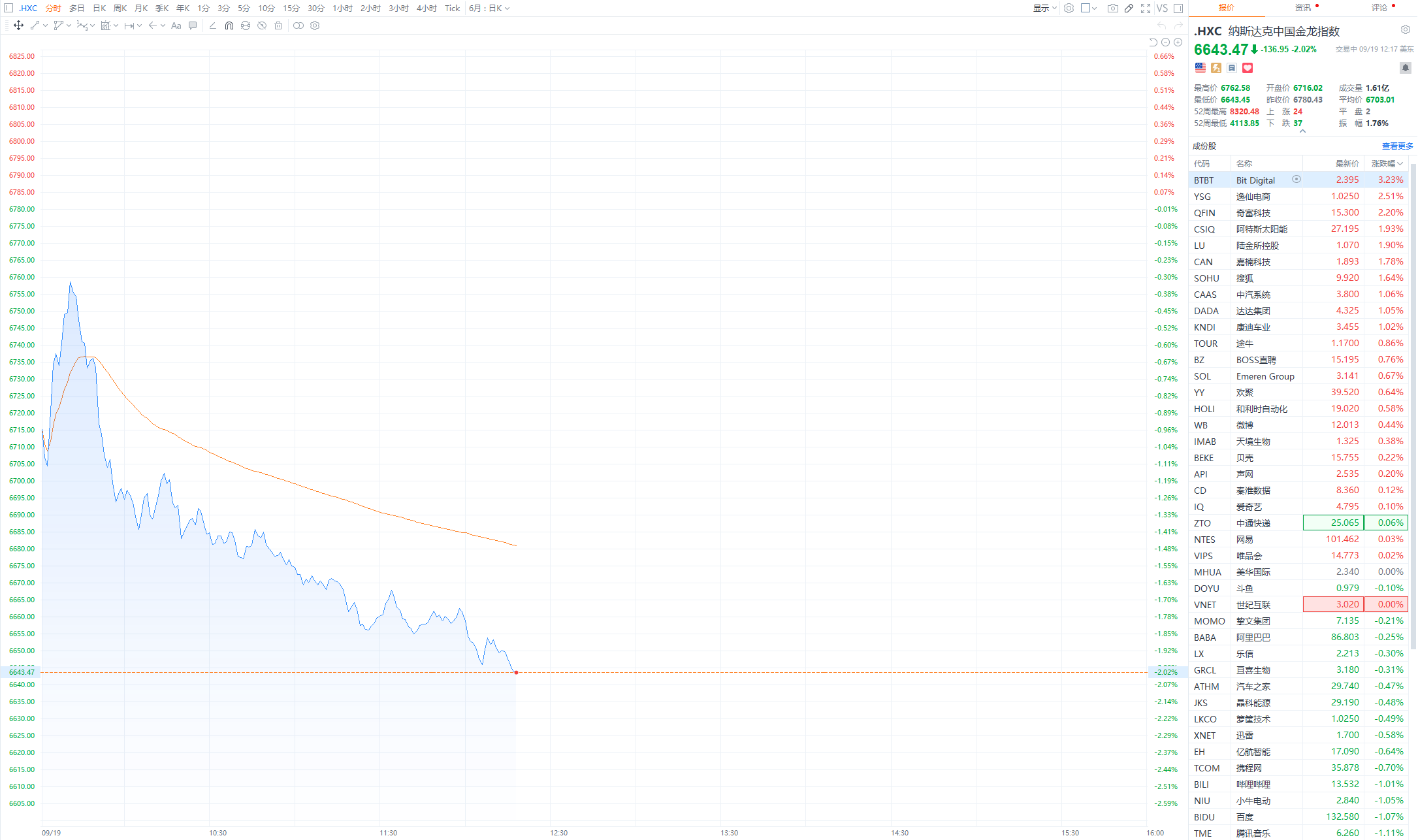财联社9月20日电,纳斯达克中国金龙指数跌幅扩大至2%。蔚来跌超14%,小鹏汽车跌超6%,名创优品跌超4%,理想汽车、趣店等跌逾3%。
