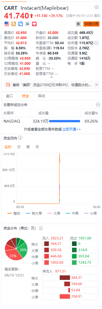 财联社9月20日电,美国最大在线杂货配送公司Instacart上市首日开涨逾40%,股价报42美元,IPO定价30美元/股。