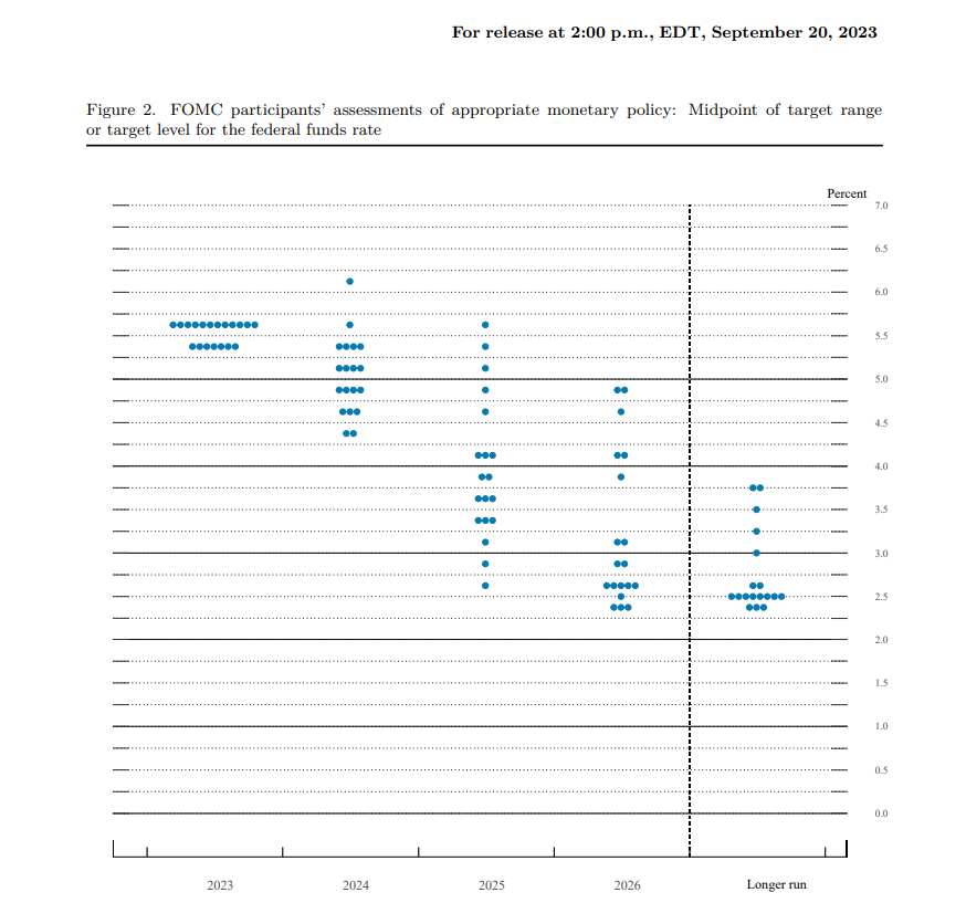 财联社9月21日电,美联储点阵图显示,预计2023年年底的联邦基金利率为5.6%,6月份料为5.6%;预计2024年年底的联邦基金利率为5.1%,6月份料为4.6%;预计2025年年底的联邦基金利率为3.9%,6月份料为3.4%;长期联邦基金利率预期为2.9%,6月份料为2.5%。