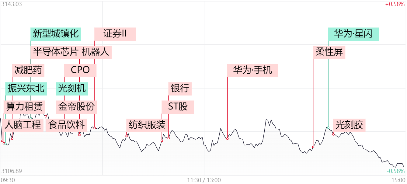 财联社9月21日电,上个交易日,三大股指继续惯性低开,旅游、酒店餐饮、一带一路等板块结束此前强势走出补跌行情,指数弱势震荡,尾盘进一步探底,深成指、创业板指再创年内新低。沪深两市成交额5732亿,较前日缩量618亿,成交金额跌破6000亿续创年内新低。1)华为产业链盘中再度活跃,板块人气高标捷荣技术走出16天11板,股价创出历史新高,日久光电5天3板2连板,万润科技3天2板。消息面上,9月19日,华为官方发布了全新HUAWEI MatePad Pro的预热海报,并预告这款13.2英寸旗舰新品将于9月25日在华为秋季全场景新品发布中亮相。2)机器人板块盘中重现活跃迹象,赛摩智能20CM涨停,中大力德涨停,赛为智能涨超10%。消息面上,9月20日,第八届华为全联接大会在上海开幕,本次大会上,华为云首席产品官将介绍华为云机器人平台。3)算力概念早盘重现强势,包括AI服务器、CPO、算力租赁等均表现不俗,远东传动4天2板,竞业达涨停。消息面上,华为创始人兼CEO任正非表示,我们即将进入第四次工业革命,基础就是大算力。4)减肥药概念盘中亦有异动表现,多肽药物方向得到市场追捧,翰宇药业、德展健康双双涨停。消息面上,翰宇药业公告,海外某客户预计向翰宇药业及翰宇武汉合计采购累计金额3000万美元(约合人民币2.19亿元(含税))的GLP-1多肽原料药。