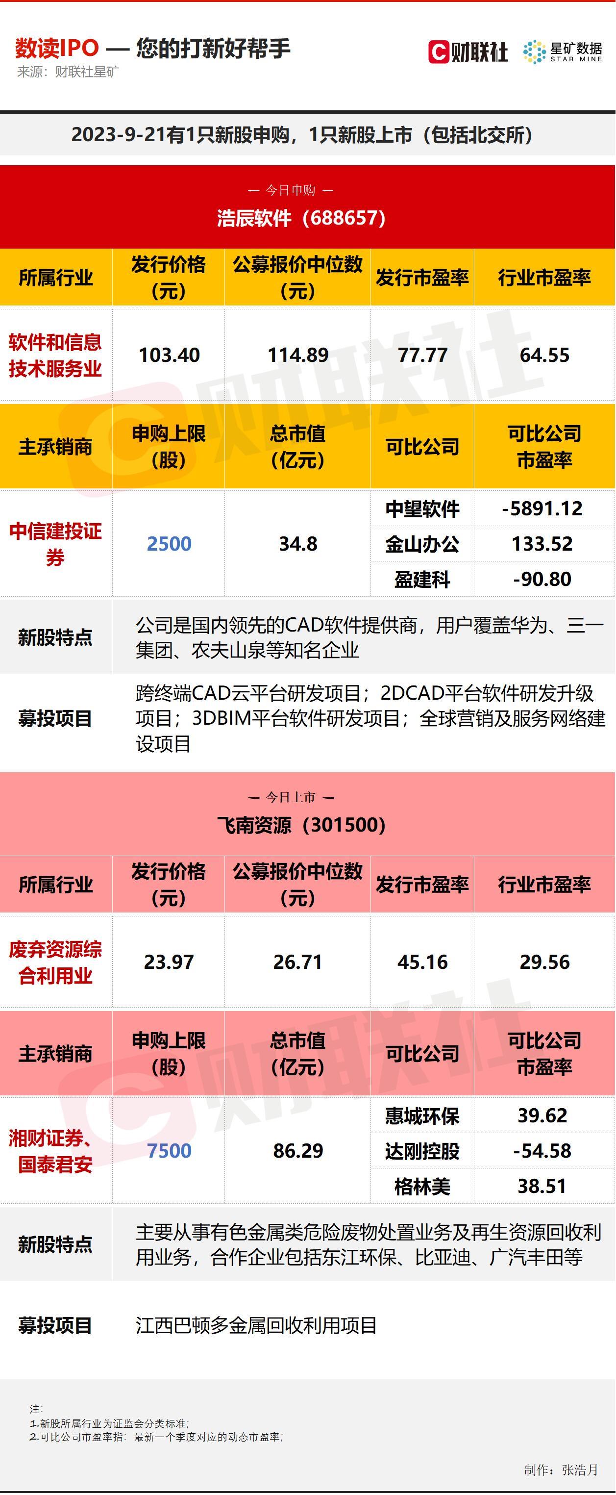财联社9月21日电,今日有1只新股申购,为科创板的浩辰软件;1只新股上市,为创业板的飞南资源。