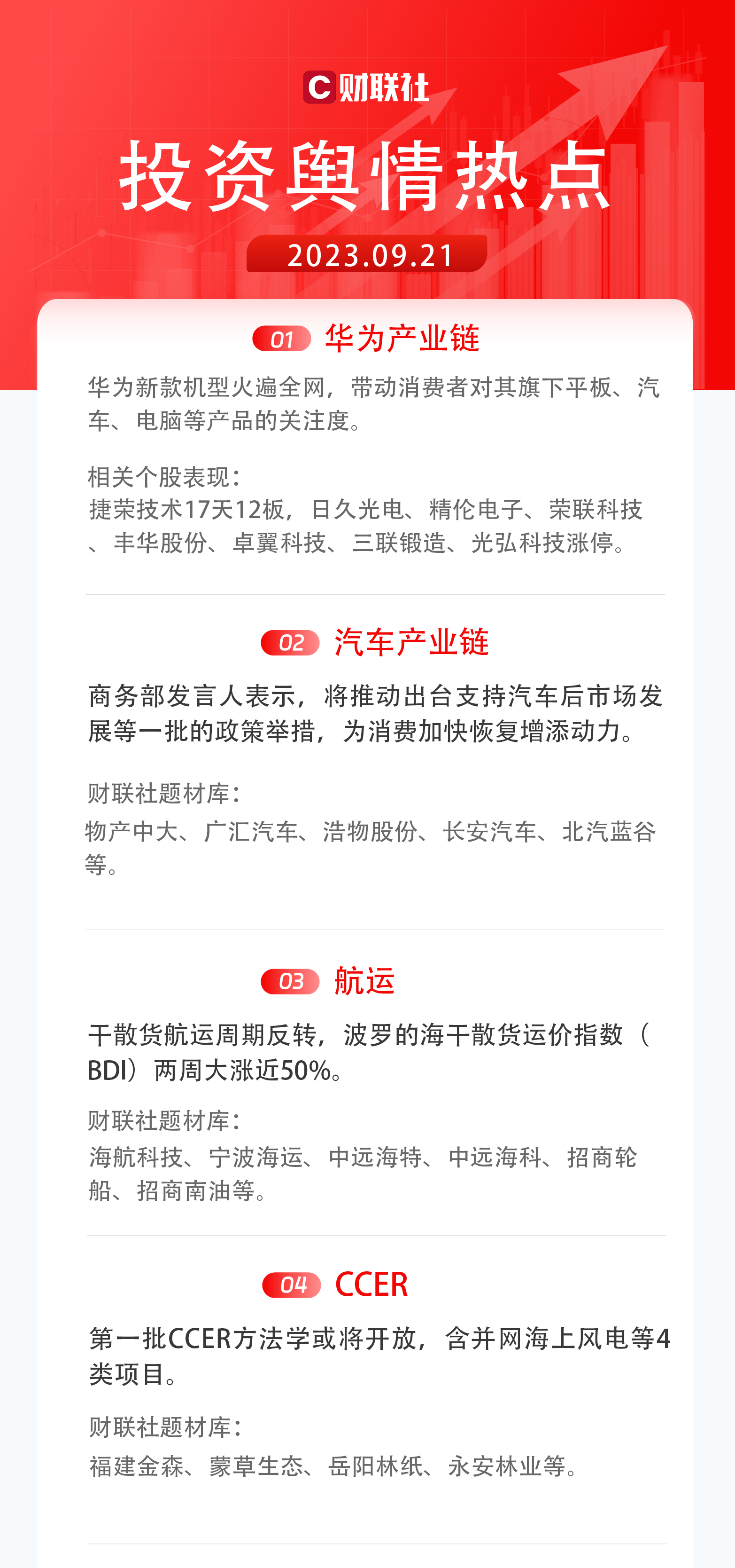 1)华为产业链:华为新款机型火遍全网,带动消费者对其旗下平板、汽车、电脑等产品的关注度。