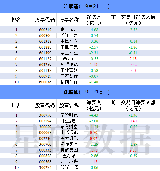 财联社9月21日电,北向资金今日净卖出43.3亿元。贵州茅台、宁德时代、中国平安分别遭净卖出4.68亿元、4.43亿元、3.36亿元。美的集团净买入额居首,金额为1.51亿元。