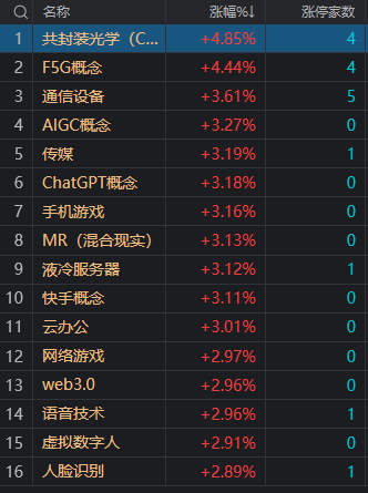 财联社9月22日电,市场早盘迎来反弹,创业板指、深成指均涨超1%。盘面上,AI概念股集体反弹,其中CPO方向大涨,太辰光、光迅科技、剑桥科技、华工科技涨停;算力概念股盘中活跃,工业富联涨超5%;ChatGPT概念股展开反弹,昆仑万维、万兴科技涨超10%。券商股开盘走强,华创云信涨停,哈投股份涨超5%。下跌方面,医药股陷入调整,人福医药、恩华药业接近跌停。总体上个股涨多跌少,两市超3800只个股上涨。沪深两市今日成交额4452亿,较上个交易日放量955亿。板块方面,CPO、传媒、液冷服务器、算力等板块涨幅居前,芬太尼、煤炭、黄金、油气等板块跌幅居前。截至收盘,沪指涨0.77%,深成指涨1.23%,创业板指涨1.43%。北向资金方面,沪股通早盘净流入15.8亿,深股通早盘净流入34.09亿。