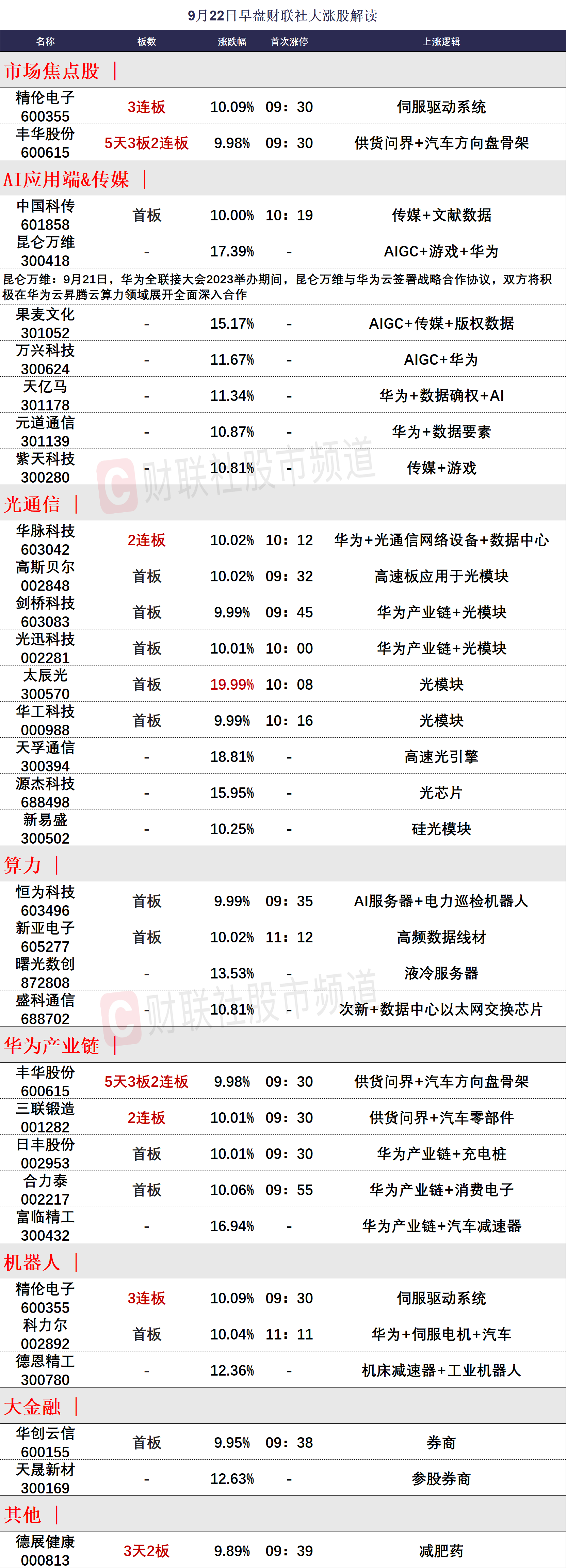 今日午盘两市共17股涨停,连板股总数4只,11股封板未遂,封板率为61%(不含ST股、退市股及未开板新股)。个股方面,机器人概念股精伦电子3板,华为产业链的丰华股份5天3板、三联锻造2板,光通信板块华脉科技2板、太辰光创业板首板。