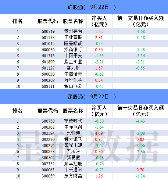 财联社9月22日电,北向资金今日净买入74.93亿元。比亚迪、工业富联、赛力斯分别获净买入4.69亿元、2.81亿元、1.57亿元。宁德时代净卖出额居首,金额为6.3亿元。