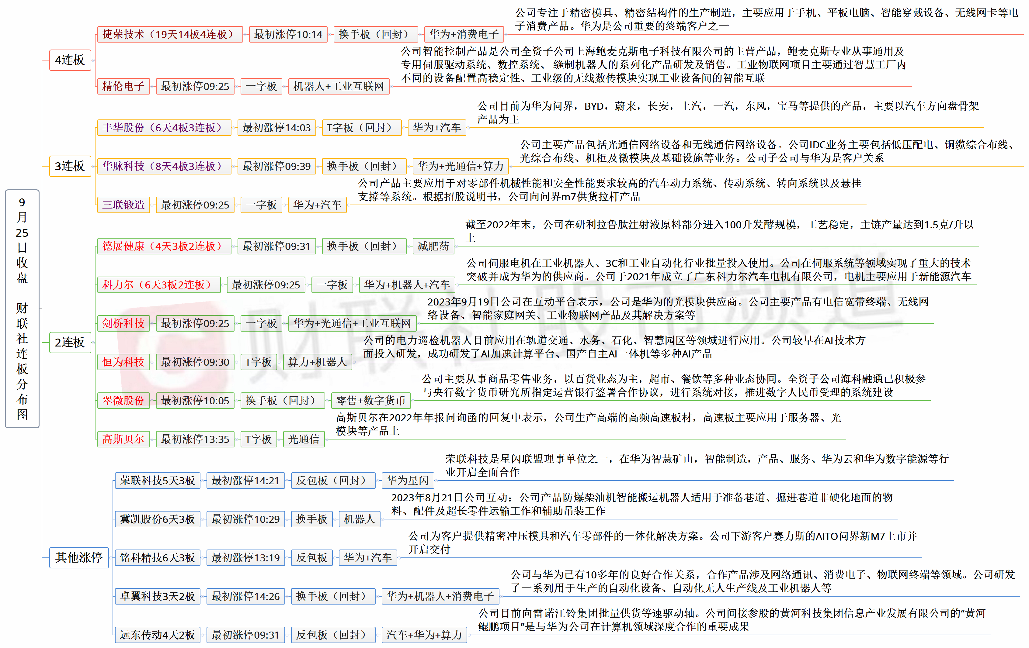 今日共27股涨停,连板股总数11只,其中三连板及以上个股5只,上一交易日共5只连板股,连板股晋级率100%(不含ST股、退市股及未开板新股)。个股方面,两市超3300只个股下跌,ST个股继续大面积补跌,25只ST股跌停,其中9只ST股二连跌停。短线情绪十分亢奋,连板股晋级率达到了夸张的100%,华为概念股涨幅领先,捷荣技术19天14板、丰华股份6天4板、华脉科技8天4板等。板块方面,上周五推动指数上涨的AI硬件与券商板块迅速退潮,尤其是券商板块,华创云信、太平洋、首创证券均跌超5%,拖累指数下行;活跃资金重返华为产业链,华为汽车、华为算力、华为星闪等分支皆有强势表现。沪深两市成交额7179亿,较上个交易日缩量475亿,超级黄金周即将到来,市场难改缩量震荡格局。