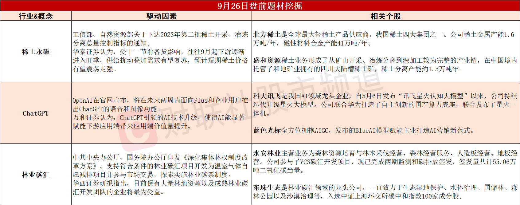 ①稀土行业步入传统旺季,业绩或将迎来大幅改善。②ChatGPT将推出全新图像功能,有望为下游应用端带来价值增量。③中办、国办支持探索实施林业碳票制度,林地资源有望迎来价值重估。