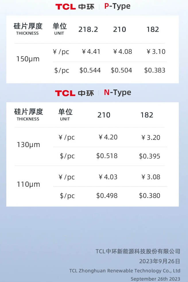 财联社9月26日电,TCL中环9月26日公示本期单晶硅片价格。与最近一次8月21日调价相比,P型150微米182硅片价格每片降0.25元,报价3.10元/片;P型150微米210硅片价格每片降0.27元,报价4.08元/片;P型150微米218.2硅片价格每片降0.29元,报价4.41元/片;N型130微米210硅片价格每片降0.27元,报价4.20元/片。