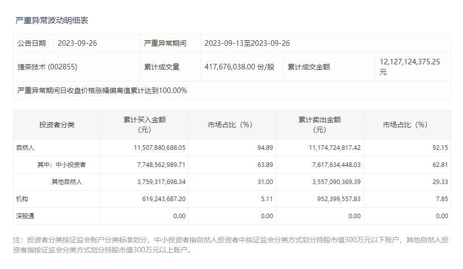 财联社9月26日电,深交所披露,捷荣技术9月13日至9月26日累计上涨97.1%,涨幅严重异常期间,获自然人买入115.08亿元,占比94.89%;其中,中小投资者累计买入77.49亿元,占比63.89%。机构投资者买入6.19亿元,占比5.11%。