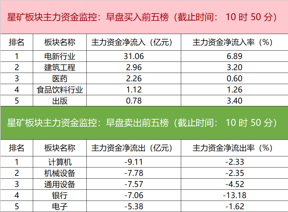 财联社9月27日电,财联社星矿数据显示,今日早盘主力资金净流入电新行业、建筑工程、医药等板块,净流出计算机、机械设备、通用设备等板块,其中电新行业净流入超31亿元。个股方面,隆基绿能大涨,主力资金净买入6.77亿元,钧达股份、爱旭股份、荣联科技获主力资金净流入居前;大华股份遭净卖出超2亿元,中兴通讯、农业银行、中国船舶主力资金净流出额居前。