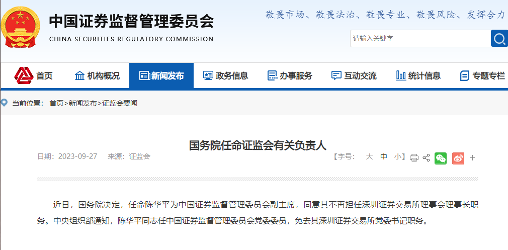 财联社9月27日电,近日,国务院决定,任命陈华平为中国证券监督管理委员会副主席,同意其不再担任深圳证券交易所理事会理事长职务。中央组织部通知,陈华平同志任中国证券监督管理委员会党委委员,免去其深圳证券交易所党委书记职务。