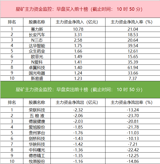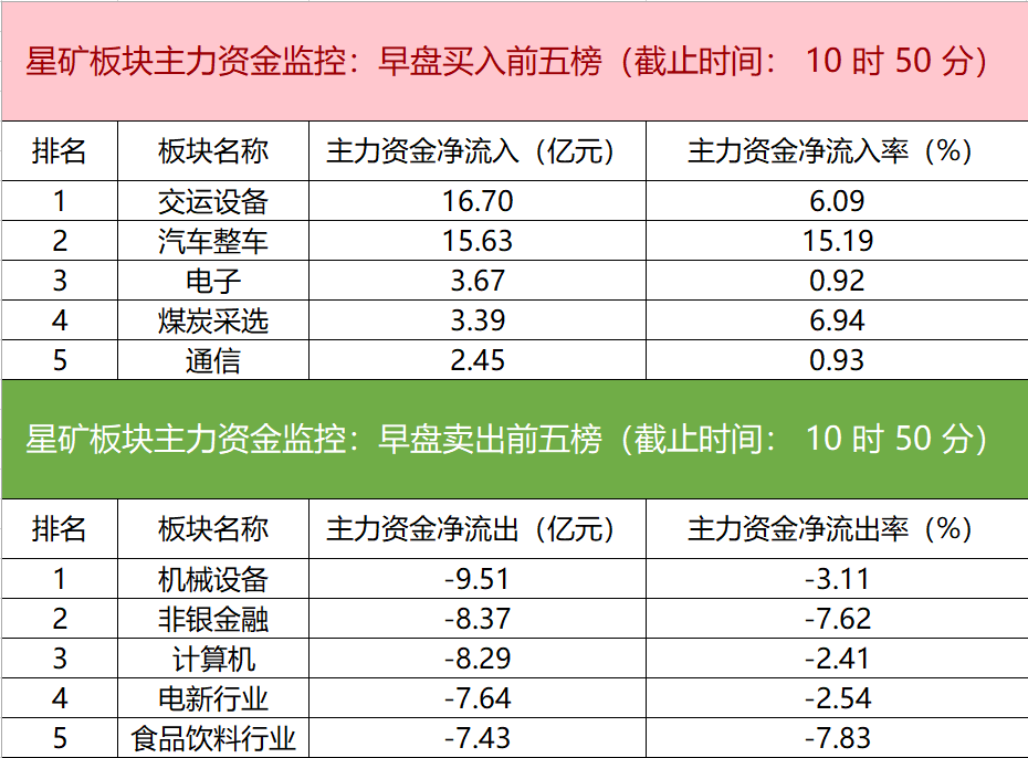 财联社9月28日电,财联社星矿数据显示,今日早盘主力资金净流入交运设备、汽车整车、电子等板块,净流出机械设备、非银金融、计算机等板块,其中交运设备板块净流入超16亿元。个股方面,赛力斯涨停,主力资金净买入10.78亿元,长安汽车、N三态、达华智能获主力资金净流入居前;荣联科技遭净卖出超2亿元,五粮液、德展健康、爱旭股份主力资金净流出额居前。