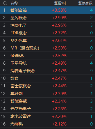 财联社9月28日电,市场早盘冲高回落,三大指数涨跌不一,指数黄白分时线走势分化,题材股表现活跃。盘面上,消费电子概念股集体反弹,格林精密、春秋电子、惠威科技、国光电器等多股涨停。汽车产业链个股震荡走强,恒勃股份、圣龙股份、赛力斯涨停。算力及CPO概念股表现活跃,中贝通信涨停。光刻胶、光刻机概念股盘中拉升,彤程新材涨停,蓝英装备涨超5%。下跌方面,减肥药概念股陷入调整,德展健康、翰宇药业跌超5%。总体上个股涨多跌少,两市超3600只个股上涨。沪深两市今日成交额4255亿,较上个交易日缩量79亿。板块方面,消费电子、教育、车联网、光刻机等板块涨幅居前,CRO、减肥药、猪肉、新型工业化等板块跌幅居前。截至收盘,沪指涨0.13%,深成指跌0.04%,创业板指跌0.39%。北向资金方面,沪股通早盘净流出8.72亿,深股通早盘净流出5.3亿。