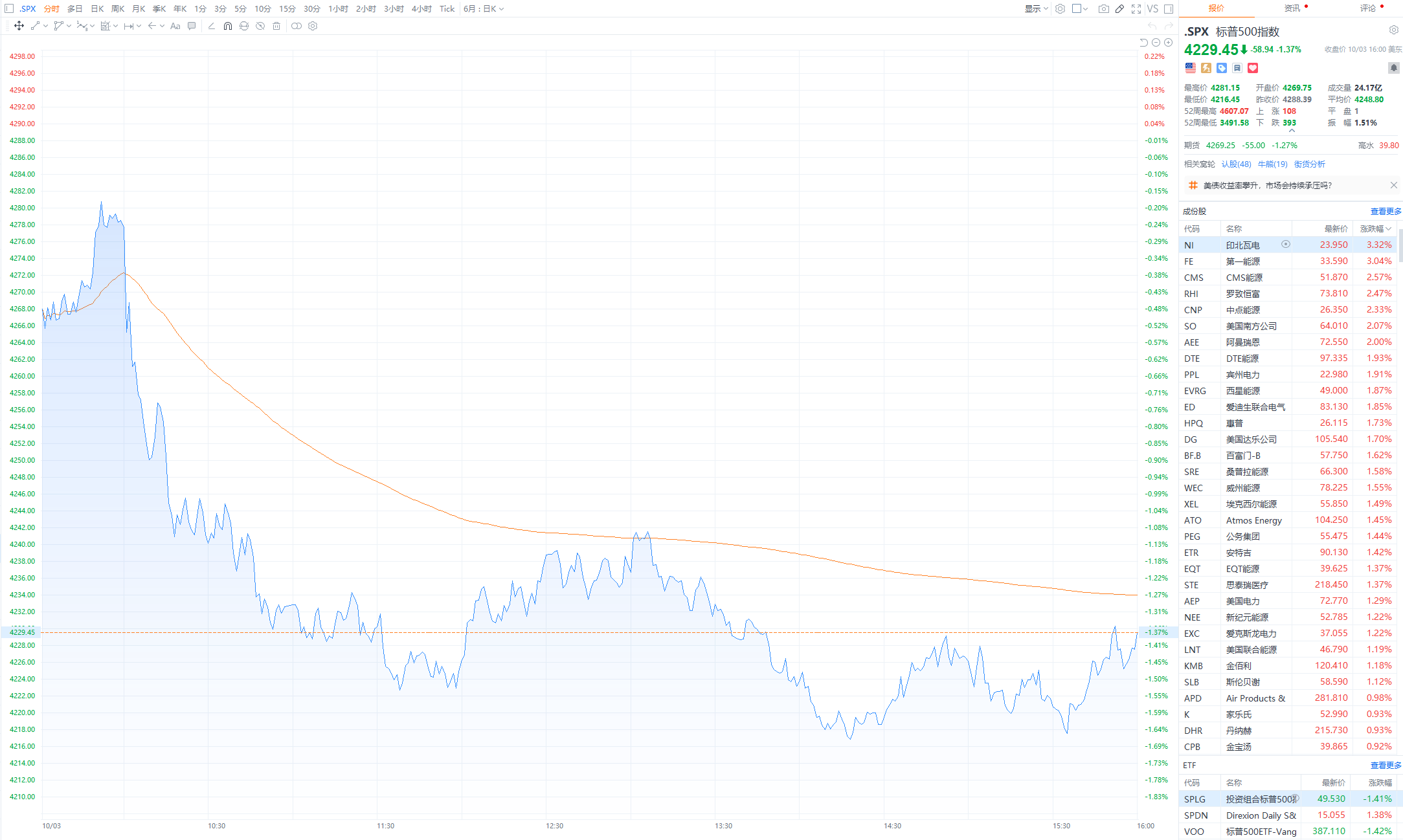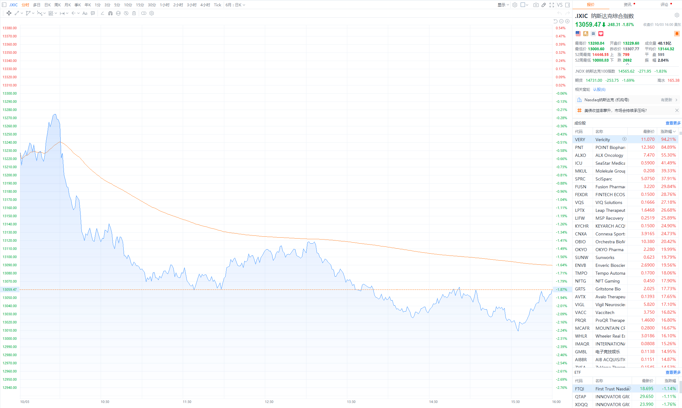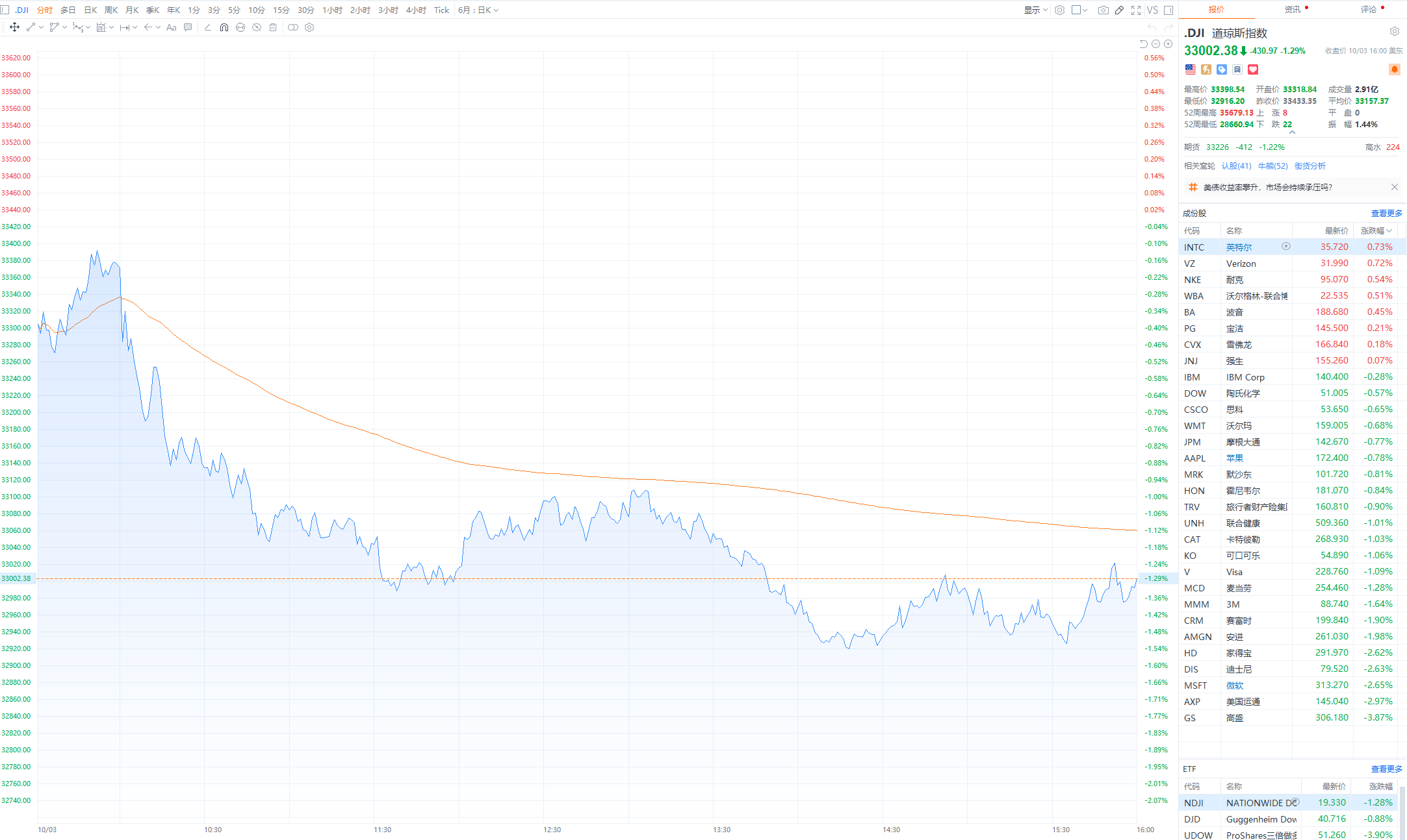 财联社10月4日电,美股低开低走,三大指数集体收跌。纳指跌1.87%,创8月底以来最大单日跌幅;标普500指数跌1.37%,道指跌1.29%,创3月22日以来单日最大跌幅,年内由涨转跌。大型科技股全线走低,亚马逊跌超3%,微软跌超2%,谷歌、脸书跌超1%,苹果、奈飞小幅下跌。银行股表现疲软,高盛跌超3%,摩根士丹利、美国银行、富国银行跌超2%,花旗跌超1%,摩根大通小幅下跌。诺瓦瓦克斯医药涨超8%,此前美国FDA批准了适用于12岁及以上人群的更新版诺瓦瓦克斯医药新冠疫苗加强针。