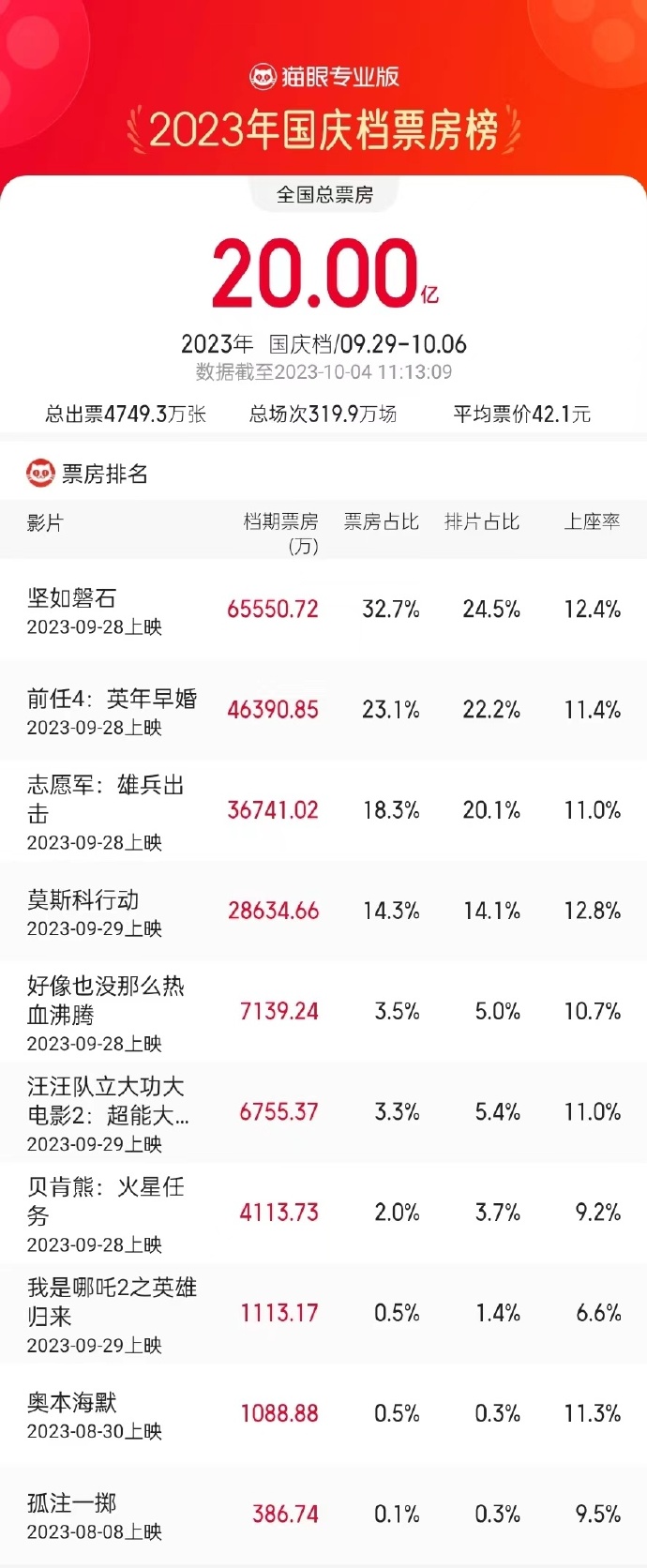 财联社10月4日电,最新统计数据显示,国庆档(9月29日-10月6日)电影累计票房(含预售实时)已超20亿元人民币。《坚如磐石》暂居票房榜首位,位居票房榜第二位和第三位的分别是爱情题材电影《前任4:英年早婚》和战争题材电影《志愿军:雄兵出击》,均为国产新创作品。