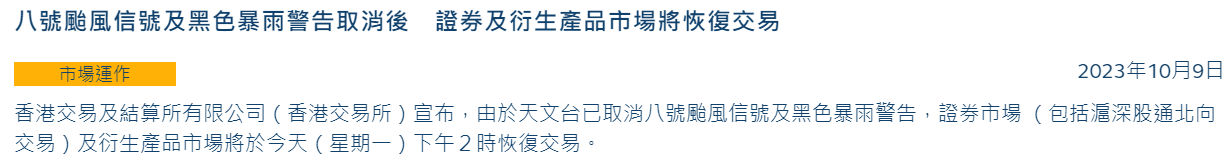 港交所:八号台风信号及黑色暴雨警告现正生效 证券及衍生产品市场延迟开市